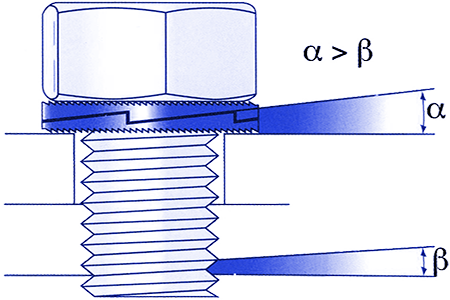 TOP-LOCK® washer is made from two identical gaskets and the outside of each with radial repousse,inside for helical surface. The unique inside of helical surface’s angle of inclination αof TOP-LOCK® washer is bigger than the bolt thread tilt angle β. When assembling, the inside of the helical surfaces are relative and the coefficient of friction of the outside knurled surface of the washer is more higher than the coefficient of friction of the cam surface ,and the ends of the interfaces are in occlusal status. When the joints are affected by vibrations and bolt looseness trend occurs , it will only allow relative movement between two slices of gasket inside helical, raising tension. Unique teeth system using the tension in the joint of fastening produces a high resistance to vibration.
